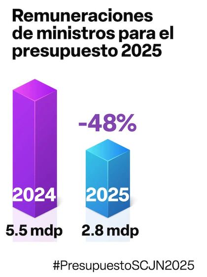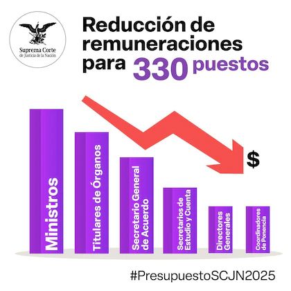 Durante una sesión privada celebrada el 24 de octubre, el pleno de la Suprema Corte de Justicia de la Nación (SCJN) aprobó su Proyecto de Presupuesto de Egresos para 2025, en el que se contempla la reducción salarial de 330 altos funcionarios de este tribunal, incluidos los 11 ministros. Lo anterior, para cumplir con la orden de la reforma judicial que señala que las remuneraciones de los funcionarios judiciales deben ser menores a los de la persona que presida el poder ejecutivo federal.
