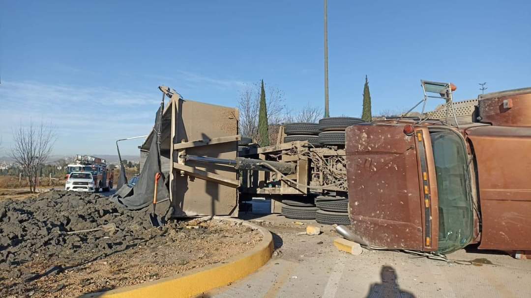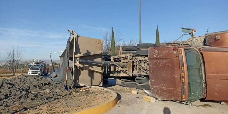 Debido al exceso de velocidad, un tractocamión cargado con jal de mina volcó en la glorieta de la Puerta del Tiempo dejando a su conductor lesionado, así como cuantiosos daños materiales y el material esparcido sobre metros.