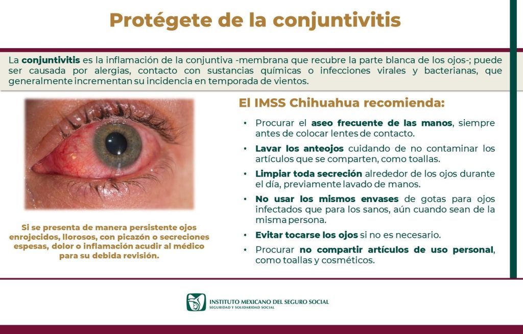 El Instituto Mexicano del Seguro Social (IMSS) en Chihuahua, a través de la Jefatura de Prestaciones Médicas, recomienda cumplir con reglas básicas de aseo para prevenir el desarrollo de conjuntivitis, ya que, ante la presencia de vientos en la entidad, esta afección afecta a la población.