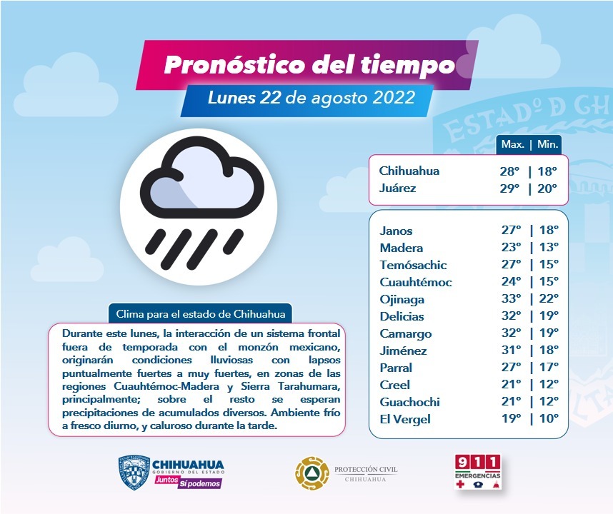 El coordinador de Protección Civil Estatal, Luis Corral Torresdey, en compañía del meteorólogo de la dependencia Ildefonso Díaz, informó que debido a la interacción de un sistema frontal con el monzón mexicano, la entidad tendrá cambios de temperatura, principalmente durante las mañanas.