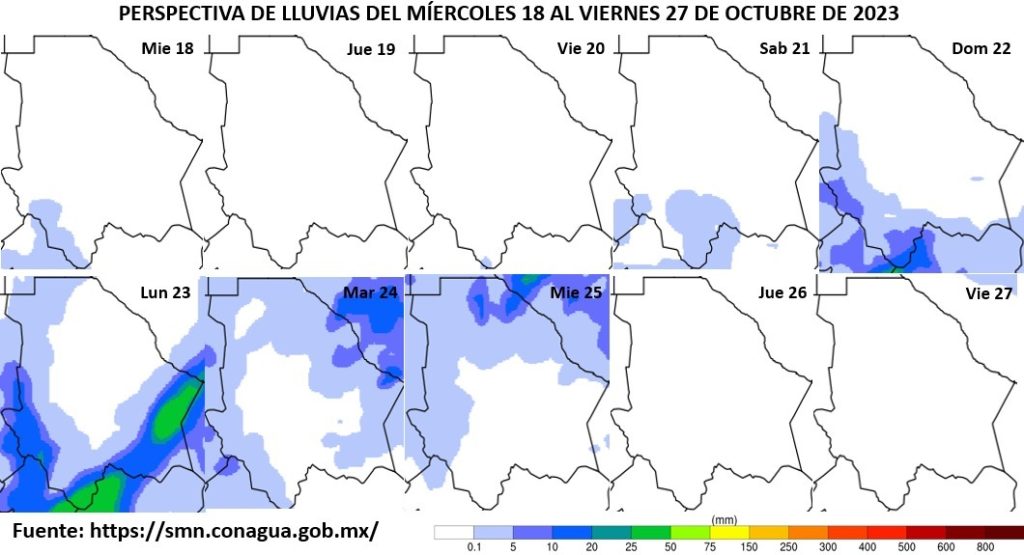 Según la información emitida por el Servicio Meteorológico Nacional (SMN), se prevé que las lluvias aisladas (de 0.1 a 2 mm) se presenten en partes de las zonas oeste y suroeste, que incluyen a Guazapares, Urique, Batopilas, Morelos, Guachochi y Guadalupe y Calvo.