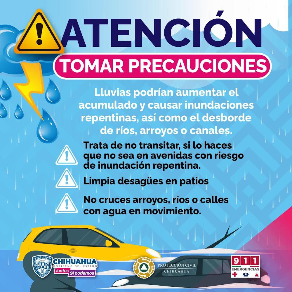 Ante estas condiciones climatológicas Protección Civil exhorta a las familias Chihuahuenses a mantener las medidas preventivas, debido a que se tiene la posibilidad de lluvias fuertes que pueden estar acompañadas de caída de granizo, tormentas eléctricas y posibles inundaciones repentinas.