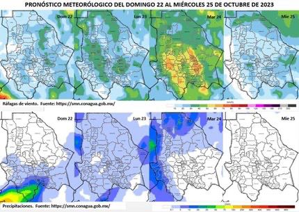 La CEPC da a conocer que hoy domingo 22 de octubre, se presentarán lluvias de fuertes a muy fuertes (de 50.1 a 75 mm) en la zona suroeste; lluvias de moderadas a puntualmente fuertes (de 25.1 a 50 mm) en Morelos y Balleza.
