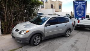 Un vehículo marca Pontiac línea Vibe modelo 2003, de color gris con placas de circulación del estado de Chihuahua, el cual no cuenta con reporte de robo.
