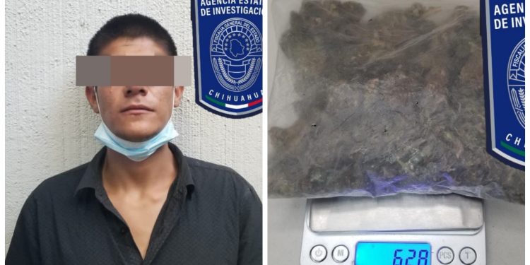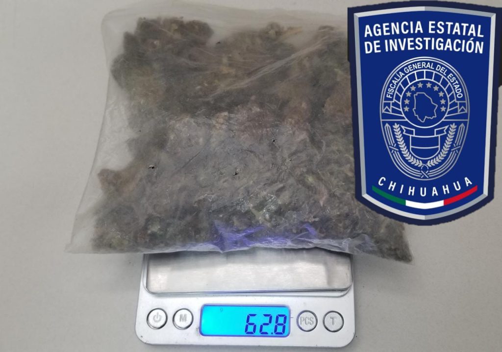 En la revisión corporal se le encontró entre sus pertenencias una bolsa de plástico transparente que contenía 62.8 gramos de marihuana.