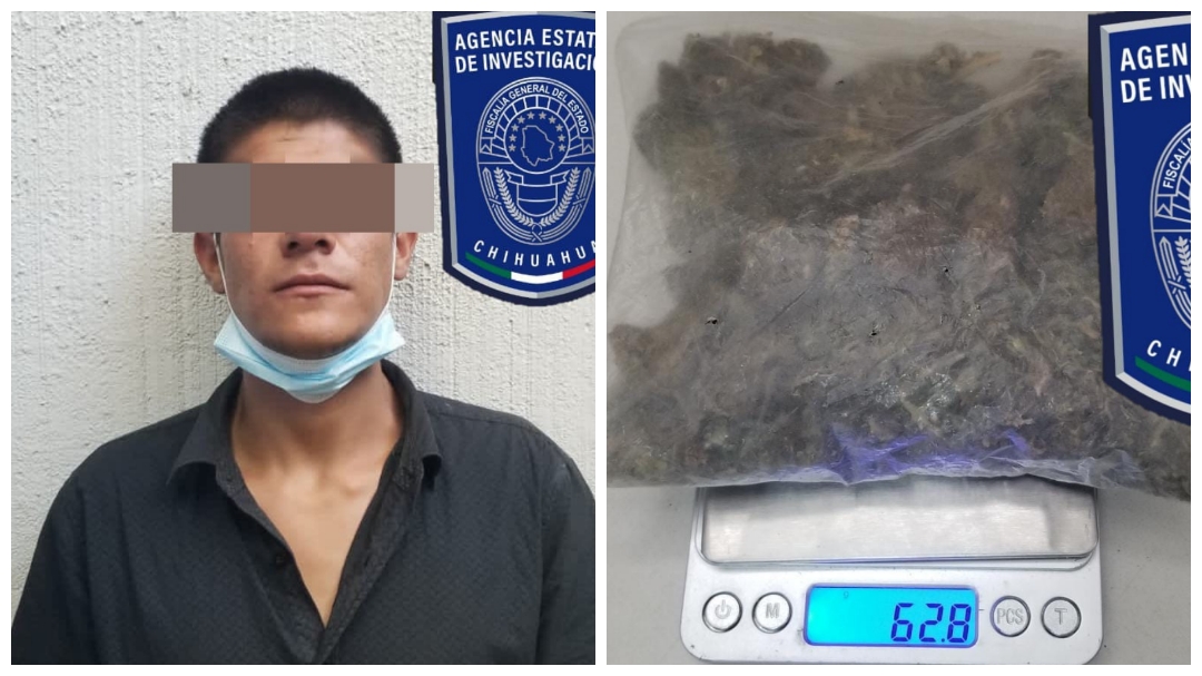 En la revisión corporal se le encontró entre sus pertenencias una bolsa de plástico transparente que contenía 62.8 gramos de marihuana.