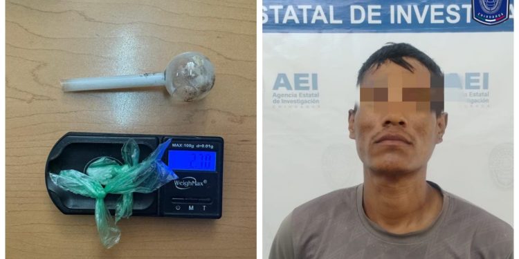 En dicho sector, los Policías Investigadores le realizaron una revisión corporal encontrándole entre sus pertenencias dos envoltorios de plástico que contenían 2.7 gramos de metanfetamina, también conocida como cristal.
