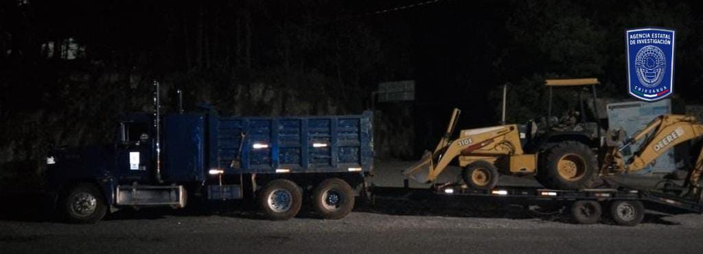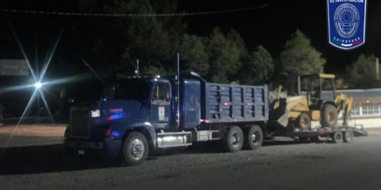 El camión de volteo asegurado, es de la marca Freightliner, color azul, modelo 1999, con placas del estado de Chihuahua número; el remolque de plataforma es modelo 2011 color amarillo con placas del estado; mientras que la retro-excavadora es de la marca Jonh Deree.