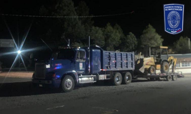 El camión de volteo asegurado, es de la marca Freightliner, color azul, modelo 1999, con placas del estado de Chihuahua número; el remolque de plataforma es modelo 2011 color amarillo con placas del estado; mientras que la retro-excavadora es de la marca Jonh Deree.