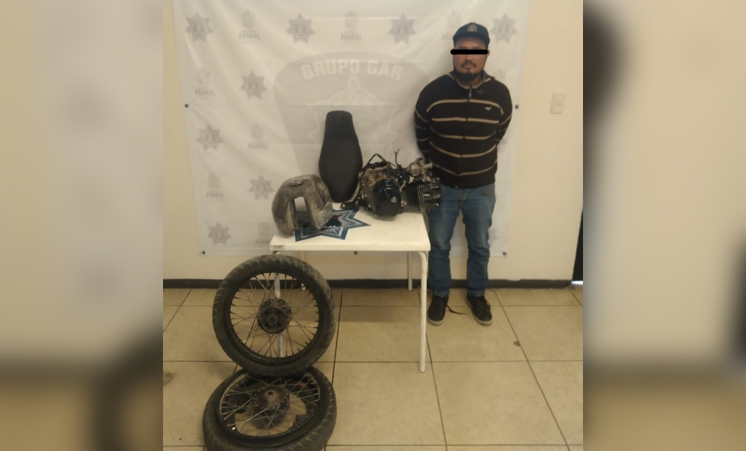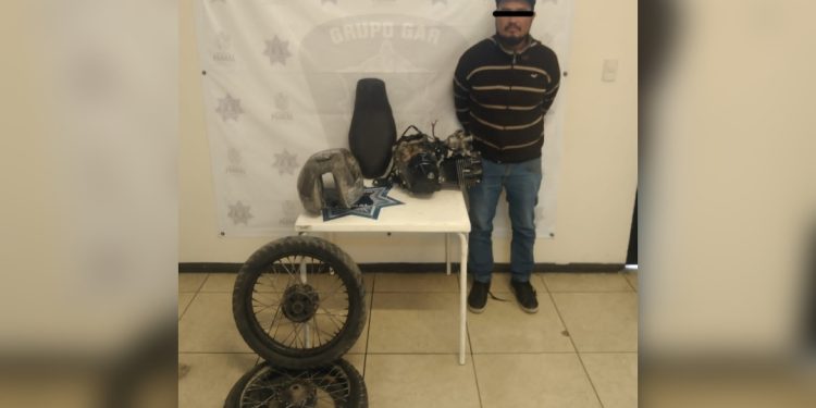 Agentes del Grupo Especial de Atención a Robos de la Dirección General de Seguridad Pública Municipal lograron la consignación de un hombre de 31 años, luego de que fuera sorprendido en posesión de una decena de partes pertenecientes a una motocicleta con reporte de robo en la colonia Federico Piñón.