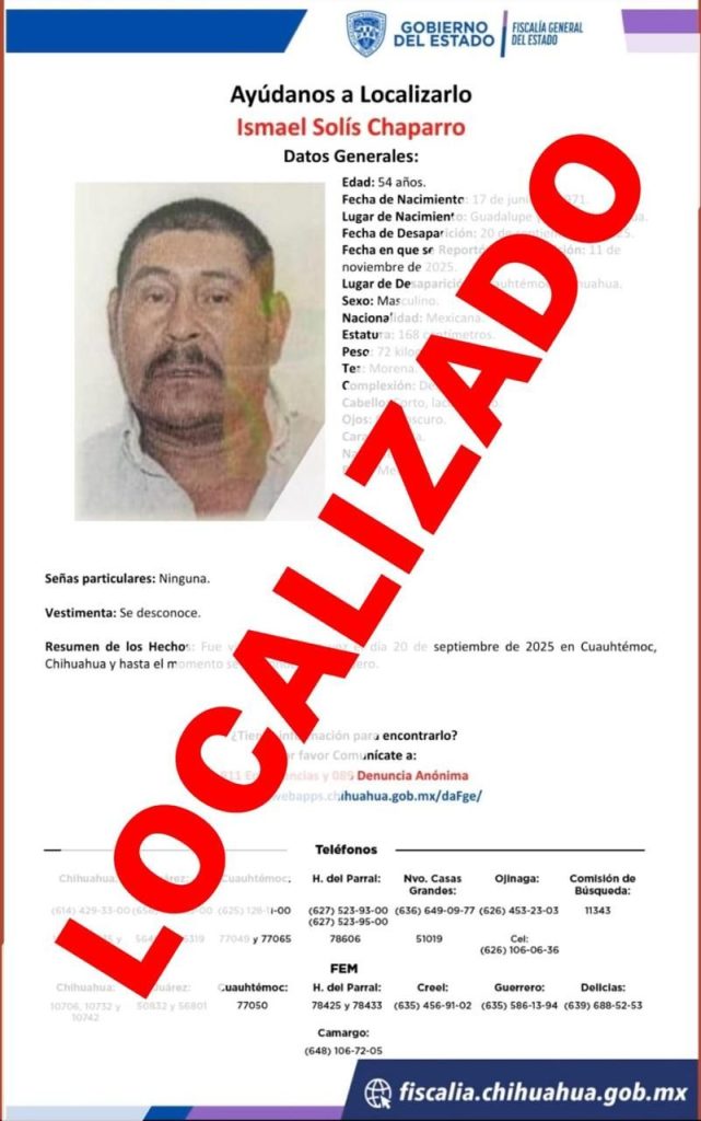 Como resultado de los trabajos permanentes de búsqueda de personas coordinados por la Fiscalía de Distrito Zona Sur, se logró localizar sano y salvo a un masculino de 54 años de edad, reportado como desaparecido el 20 de septiembre de 2025, en la ciudad de Parral.