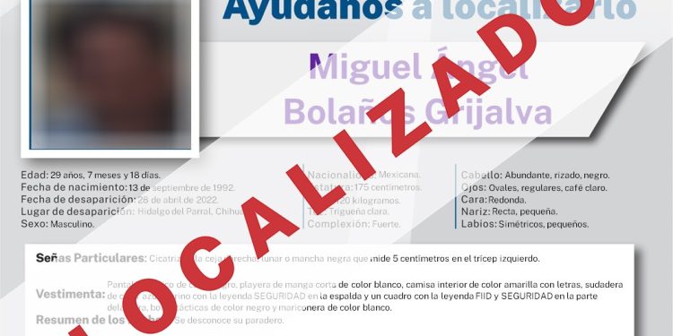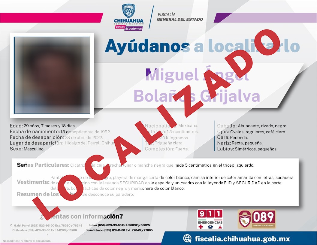 El seguimiento de los protocolos de búsqueda, permitió a los elementos de la Agencia Estatal de Investigación (AEI) del Destacamento de Parral, localizar sano y salvo a Miguel Ángel B. G., quien contaba con reporte de ausencia interpuesto por sus familiares el 28 de abril del año en curso.