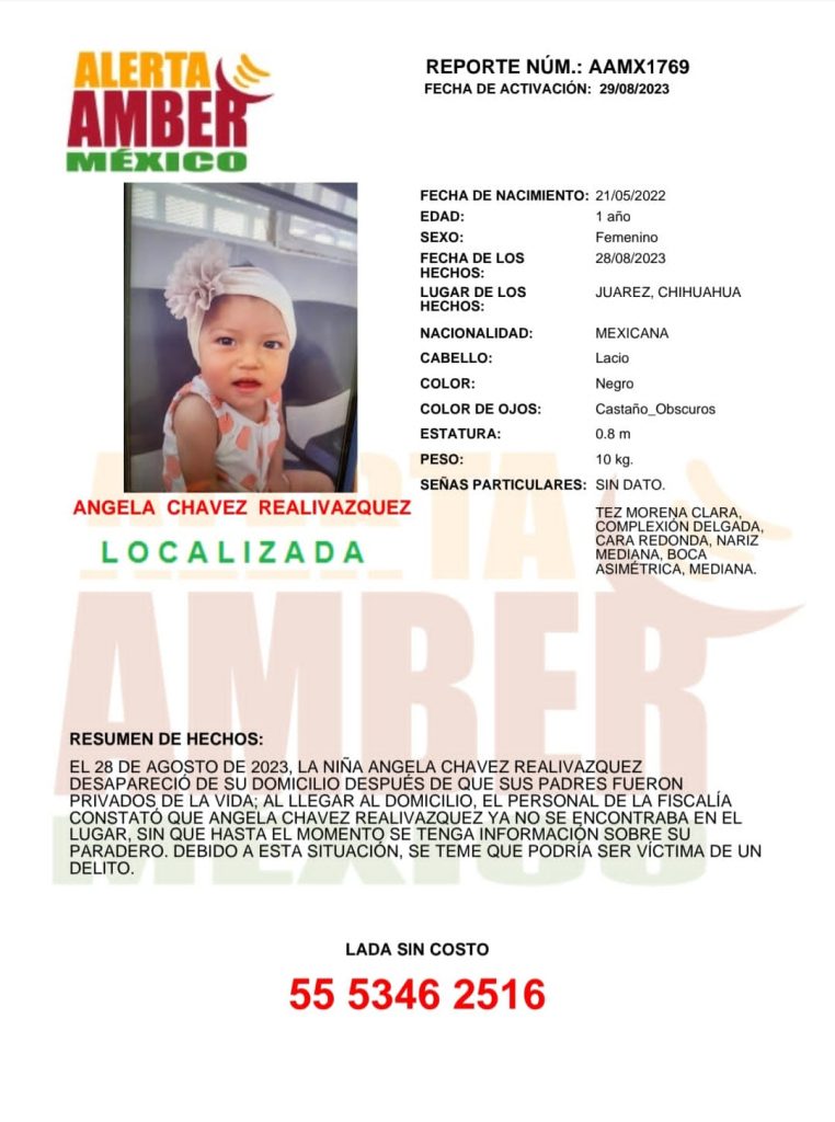 Apenas este mismo miércoles, la Fiscalía General del Estado había activado la Alerta Amber a nivel nacional y la Comisión Local de Búsqueda de Chihuahua, de la Fiscalía Especializada en Investigación de Violaciones de Derechos Humanos, ofreció una recompensa de 200 mil pesos por información para dar con su paradero.