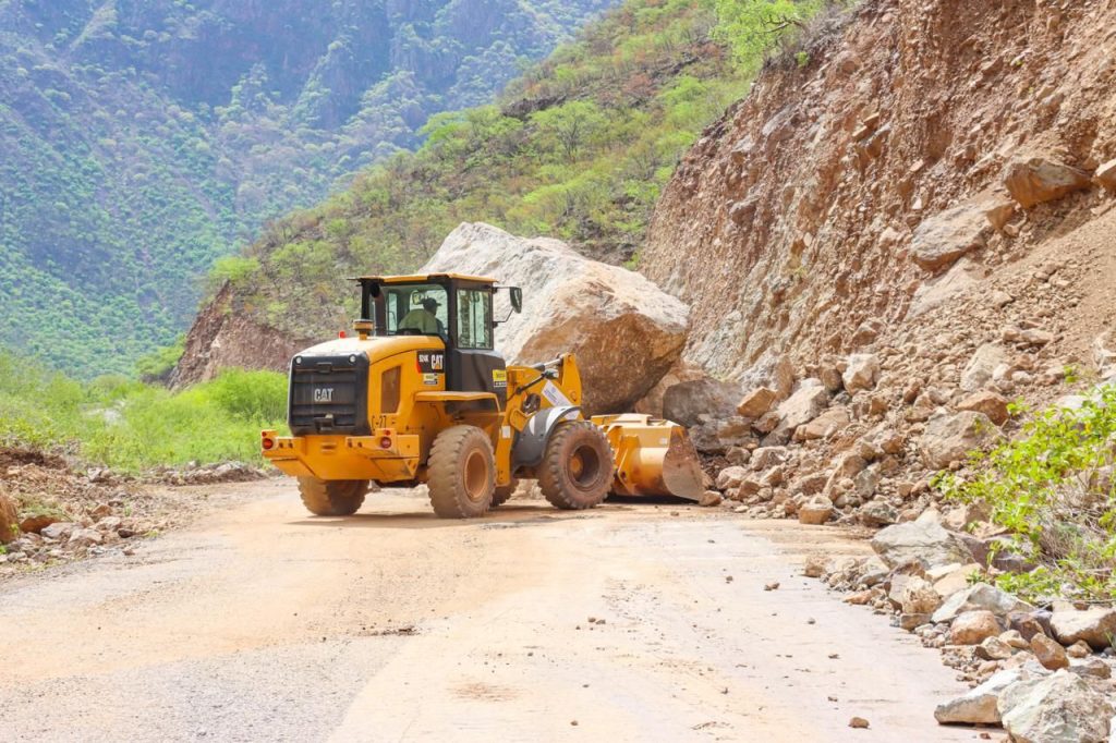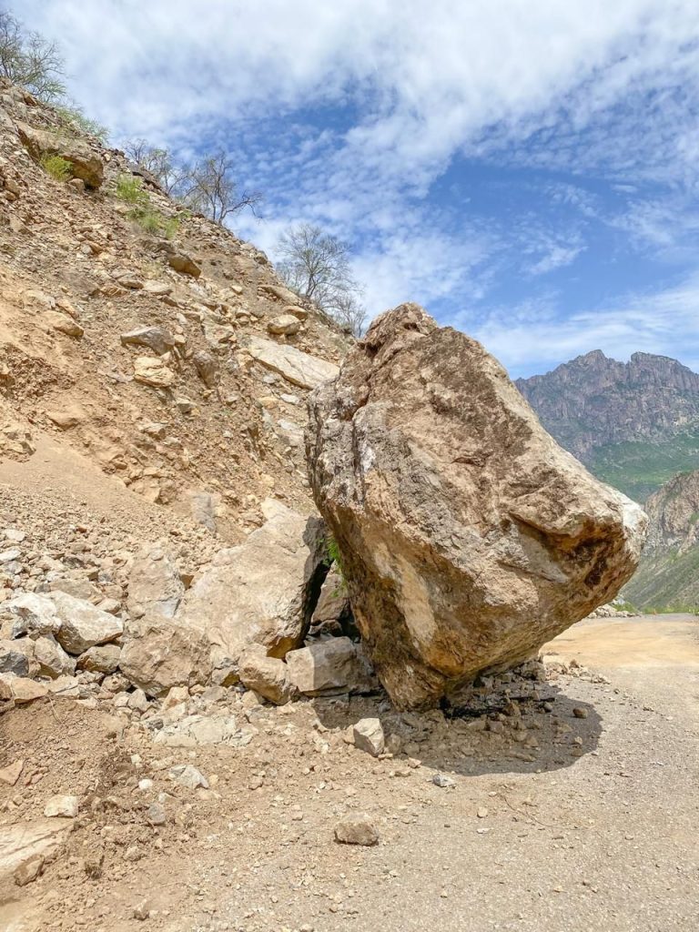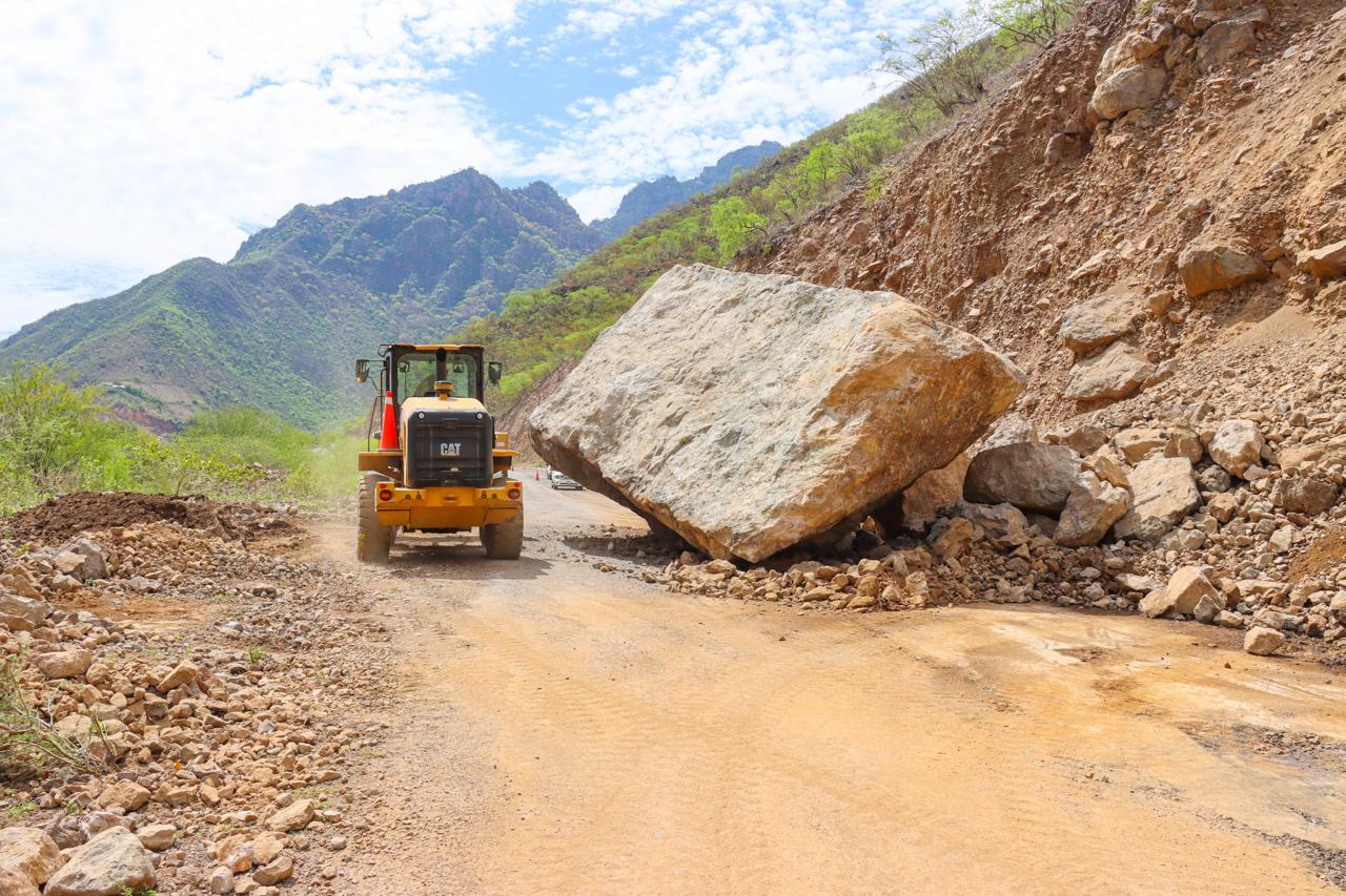 Los trabajos a cargo de la Secretaría de Comunicaciones y Obras Públicas con el apoyo del municipio de Batopilas, incluyeron el retiro de rocas que alcanzan una altura de entre 5 y 6 metros, que se desprendieron de los cerros producto de la intensa lluvia del fin de semana pasado.