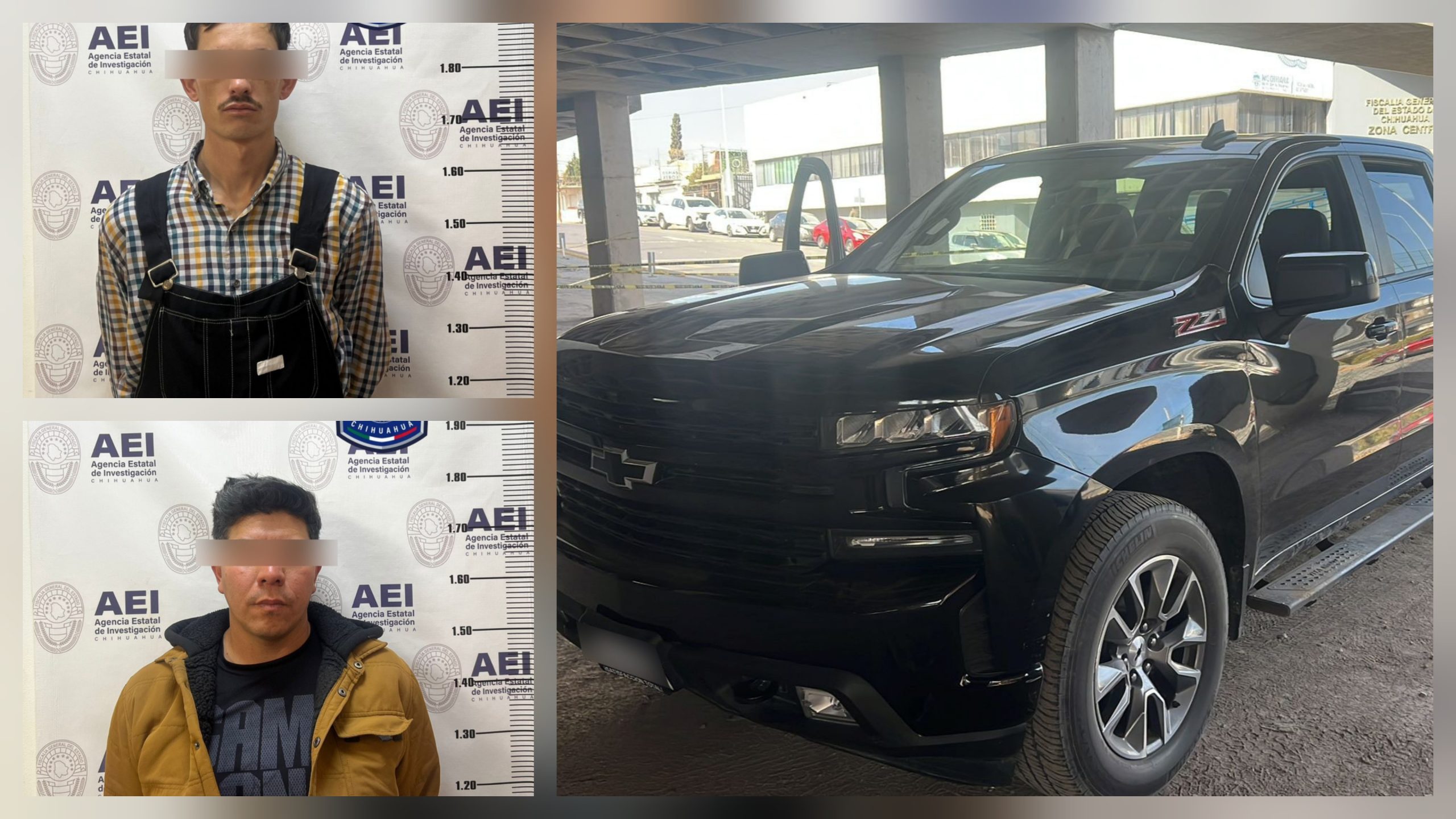 Elementos de la Agencia Estatal de Investigación adscritos a la Fiscalía de Distrito Zona Centro, detuvieron en flagrancia a dos hombres por posesión de vehículo con reporte de robo em Estados Unidos.