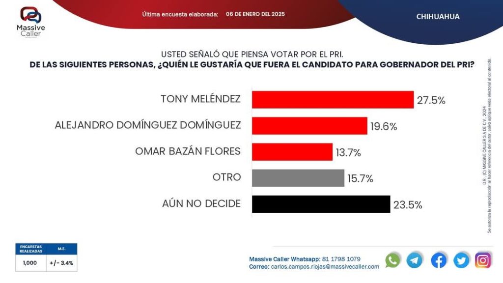 La más reciente encuesta de Massive Caller sobre las preferencias a la gubernatura de Chihuahua para 2027, arroja que, para el caso específico del Partido Revolucionario Institucional, sin alianza con Acción Nacional, el diputado federal, Tony Meléndez, aventaja en las menciones de los participantes.