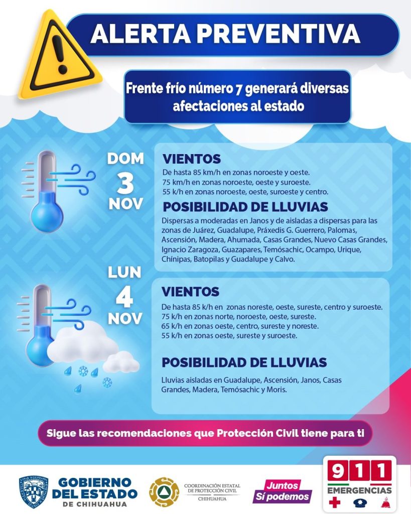 La Coordinación Estatal de Protección Civil (CEPC), informó que mantiene una alerta preventiva para la ciudadanía ante el ingreso del frente frío número 7, que traerá fuertes rachas de viento y un descenso significativo de temperaturas en las próximas horas.