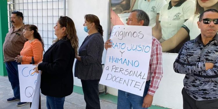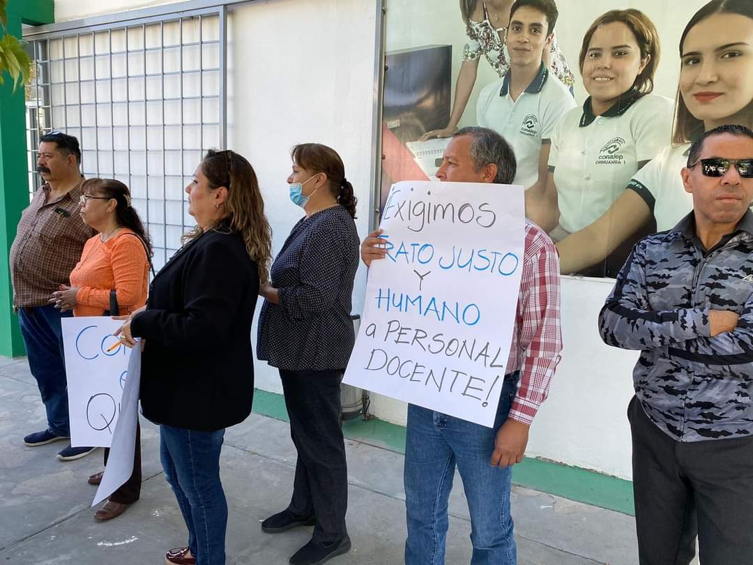 Maestros del Colegio Nacional de Educación Profesional Técnica (CONALEP), se manifestaron en las instalaciones de la Dirección General Estatal, donde manifestaron que tienen aproximadamente un año sin ser aportado el descuento que quincena tras quincena se les realiza a sus nóminas y no se va al FOVISSSTE.