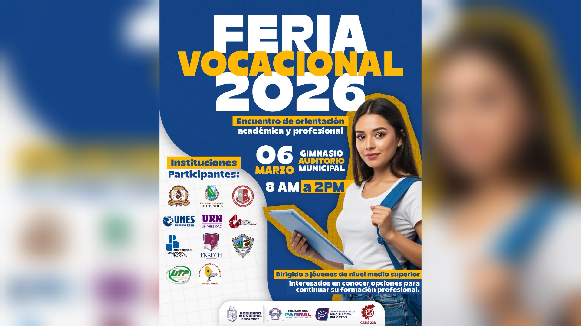 El Departamento de Vinculación Educativa, invita a los estudiantes de nivel medio superior a la «Feria Vocacional” un encuentro de orientación académica y profesional. Este evento se llevará a cabo el próximo 06 de marzo de 2026 en las instalaciones del Gimnasio Auditorio Municipal, con un horario de atención de 8:00 de la mañana a 2:00 de la tarde.