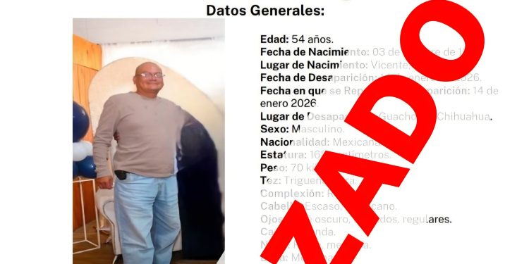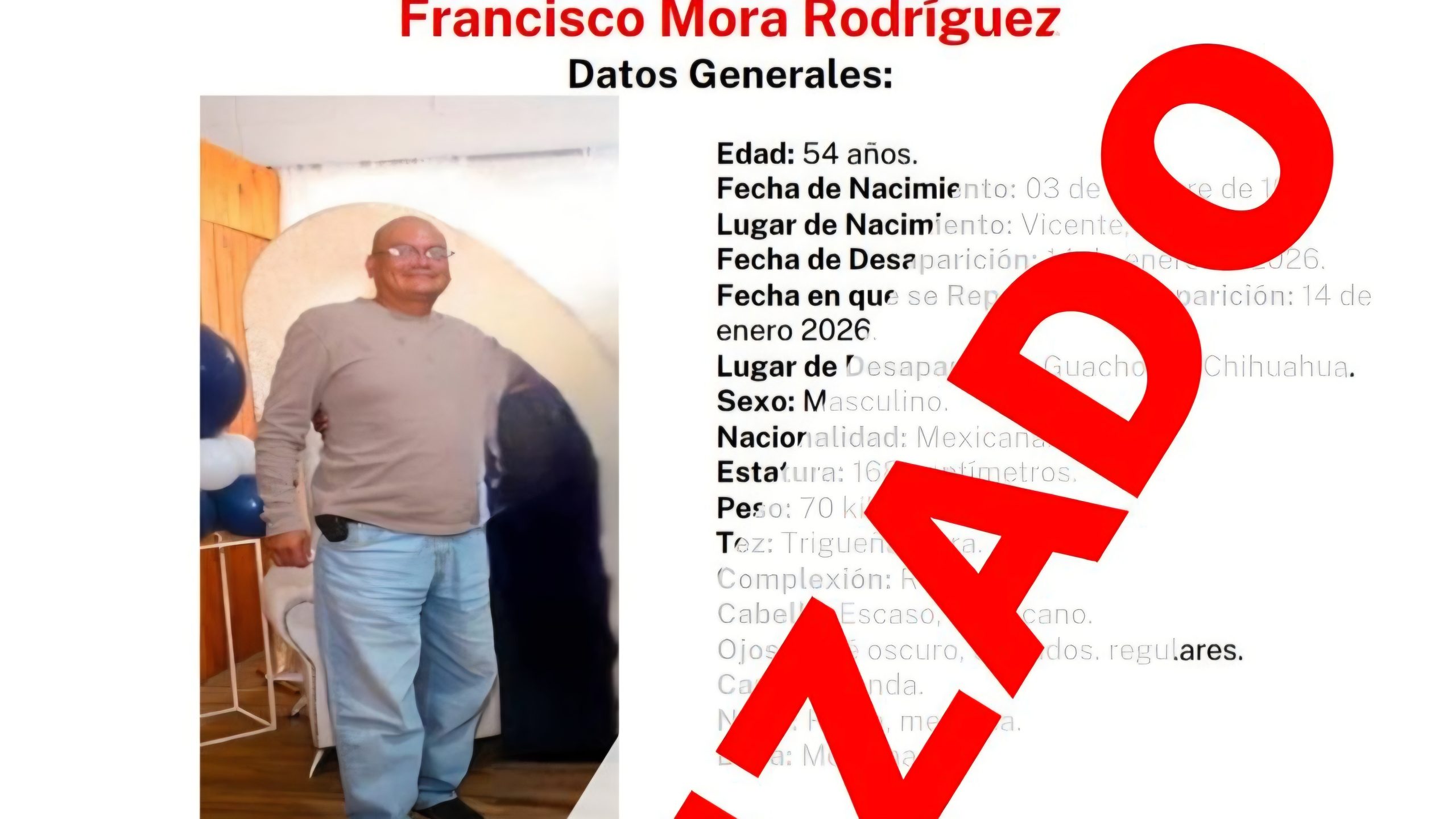 Como resultado de la activación de los protocolos de búsqueda coordinados por la Fiscalía de Distrito Zona Sur, se logró localizar sano y salvo a un masculino de nombre Francisco Mora Rodríguez, 54 años de edad, reportado como ausente el 14 de enero del presente año en el municipio de Guachochi.