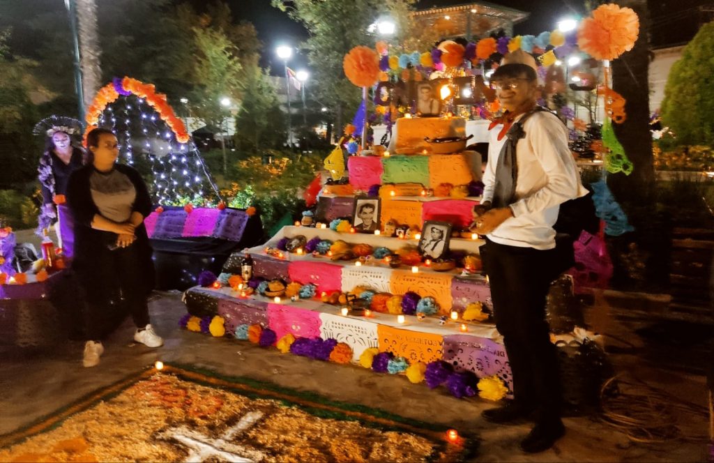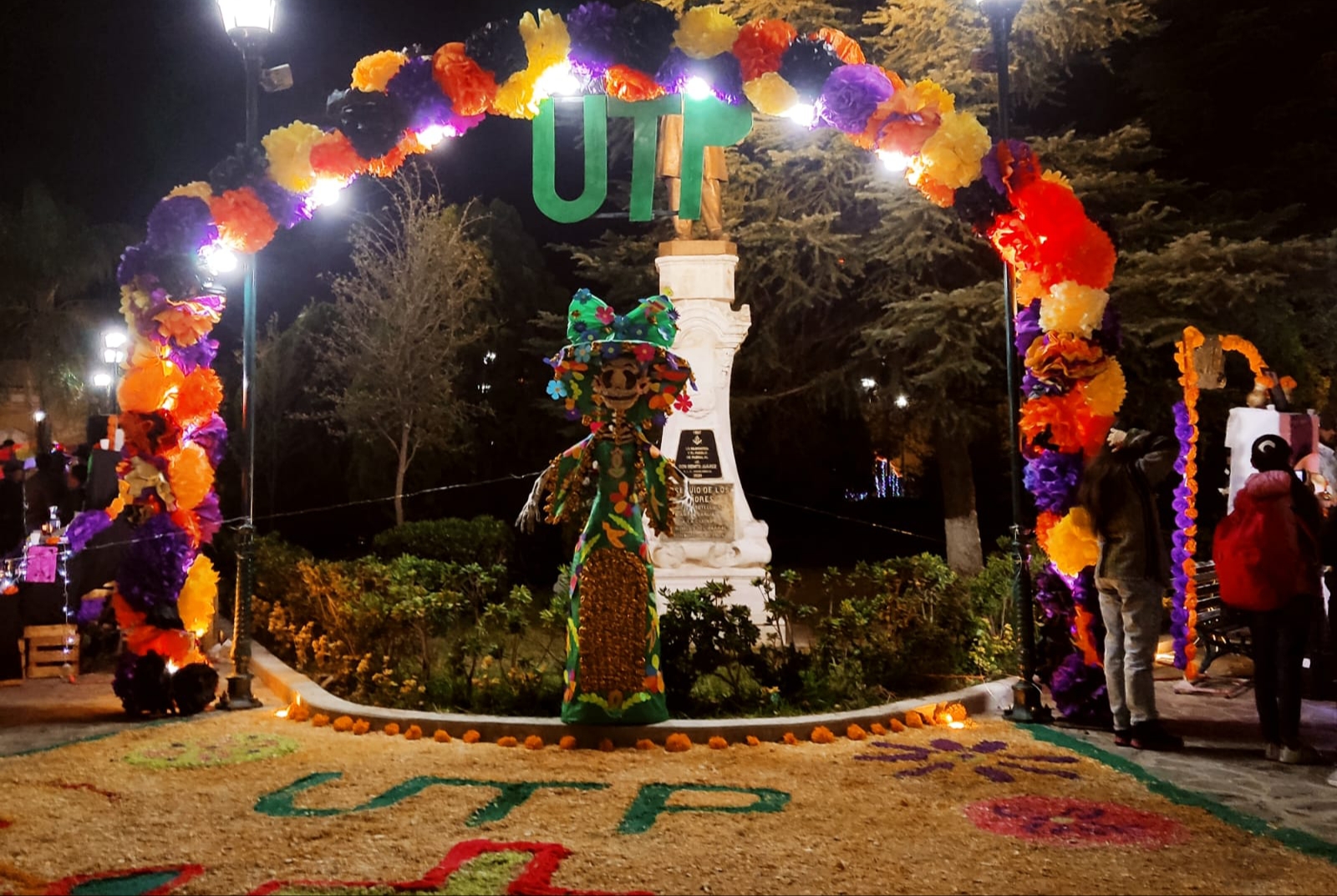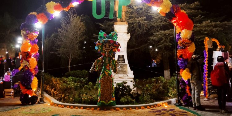 Una majestuosa decoración en el marco de la celebración del Día de Muertos fue la que realizaron estudiantes de la Universidad Tecnológica de Parral (UTP) sobre la Plaza Juárez, con 15 altares en memoria de distintos personajes que fueron propuestos por los mismos jóvenes.