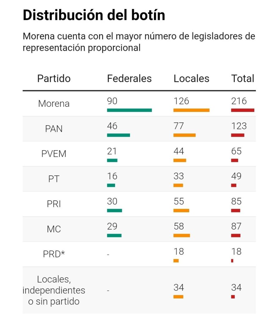 Morena es el partido que percibe el mayor número de recursos por sus legisladores plurinominales. El partido en el poder cuenta con 216 parlamentarios bajo ese esquema, 90 federales y 126 locales. Esto lo hace acreedor a una bolsa de más de 313 millones de pesos al año.