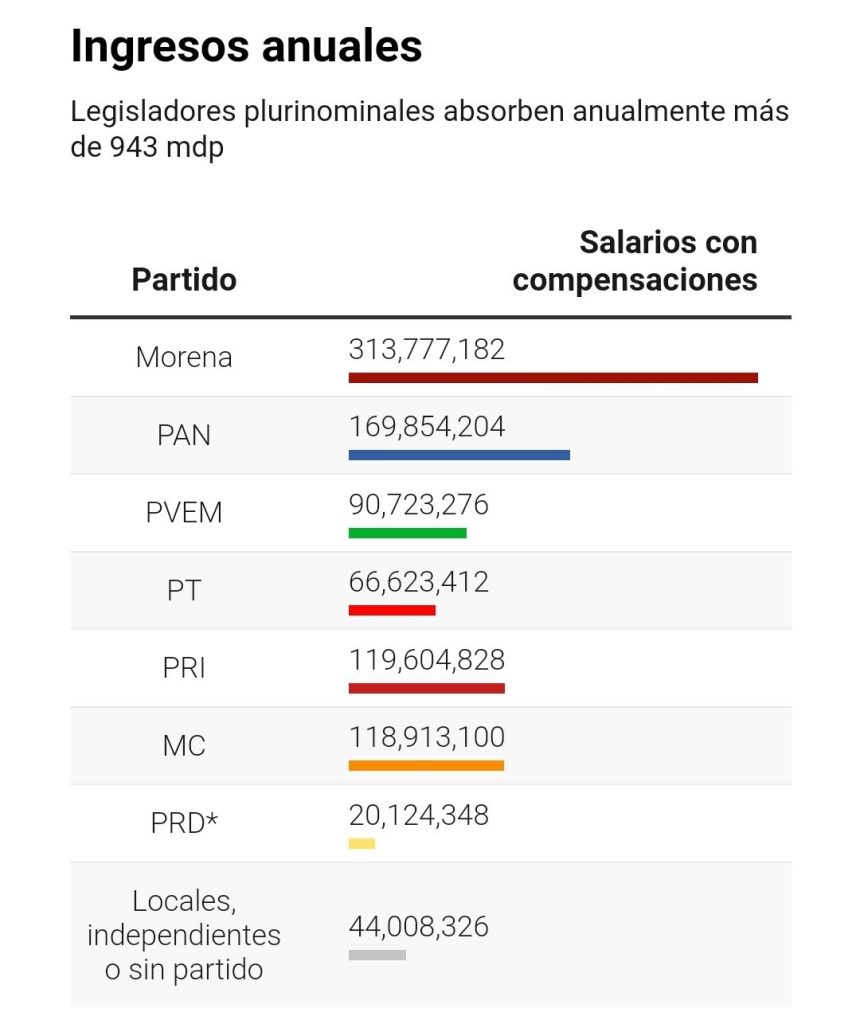Ocurre lo mismo en ambas cámaras del Congreso de la Unión. El presupuesto anual por concepto de salarios con compensaciones para los 200 diputados federales pluris (77 de Morena, 40 del PAN, 26 del PRI, 26 de MC, 18 del PVEM y 13 del PT) es de 313 millones de pesos, mientras que para los 32 congresistas de representación proporcional en el Senado de la República (13 de Morena, seis del PAN, cuatro del PRI, tres del PVEM, tres del PT y tres de MC) es de 72.9 millones de pesos.
