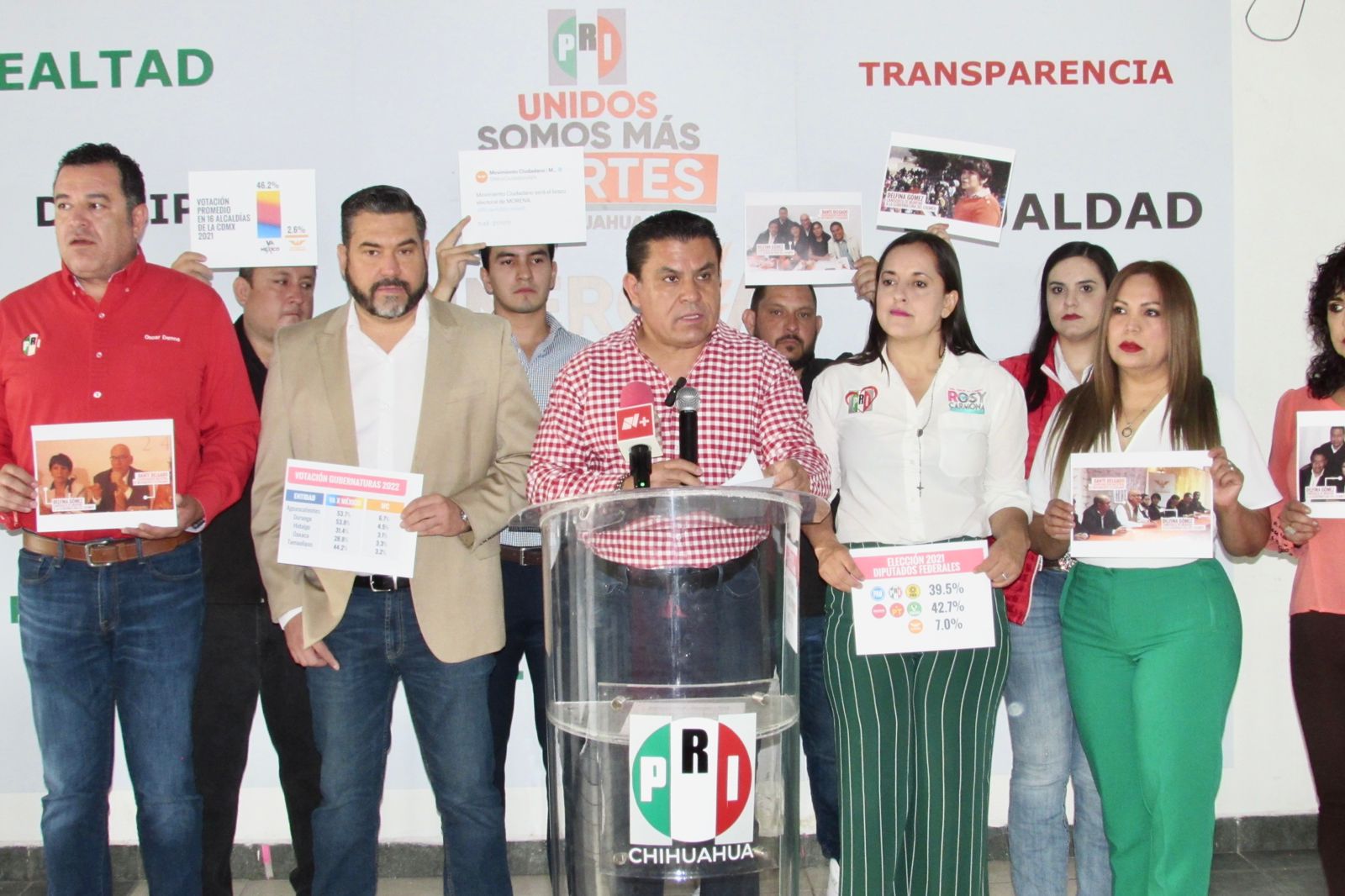 El presidente tricolor, Alex Domínguez encabezó una conferencia de prensa en en las instalaciones del Comité Municipal del PRI en Chihuahua, en compañía de la dirigencia municipal a cargo de Rosy Carmona y Oscar Derma, así como la compañía del diputado local Edgar Piñón y líderes se sectores y organizaciones.