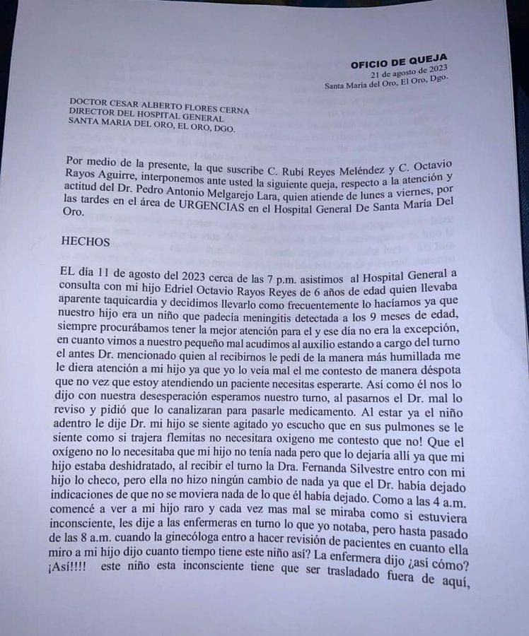 La mamá de un menor de 6 años de edad denunció públicamente en una carta enviada al doctor César Alberto Flores Cerna, director del Hospital General de Santa María del Oro, Durango, al médico Pedro Antonio Melgarejo Lara, quien atiende de lunes a viernes por las tardes en el área de Urgencias de ese nosocomio por considerar que su actitud en la atención al niño, derivó en la muerte de este.