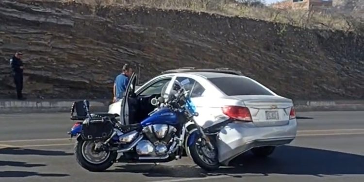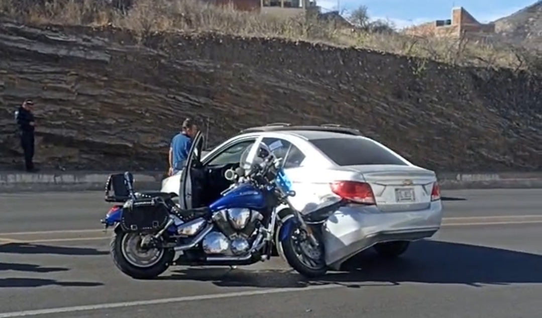 Una motocicleta y un automóvil compacto protagonizaron un choque sobre el periférico sur «Luis Donaldo Colosio» que dejó como saldo únicamente daños materiales.