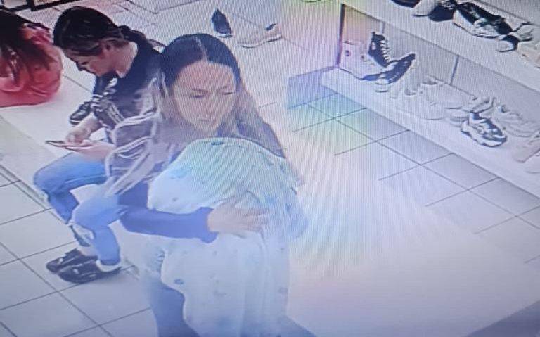Una de las cámaras del circuito cerrado de una tienda del centro de la ciudad, logró captar el rostro de una de las presuntas defraudadoras, misma que carga en brazos lo que parece ser un bebé o la cobija en la que se arroparía. A sus espaldas, quien sería su cómplice.