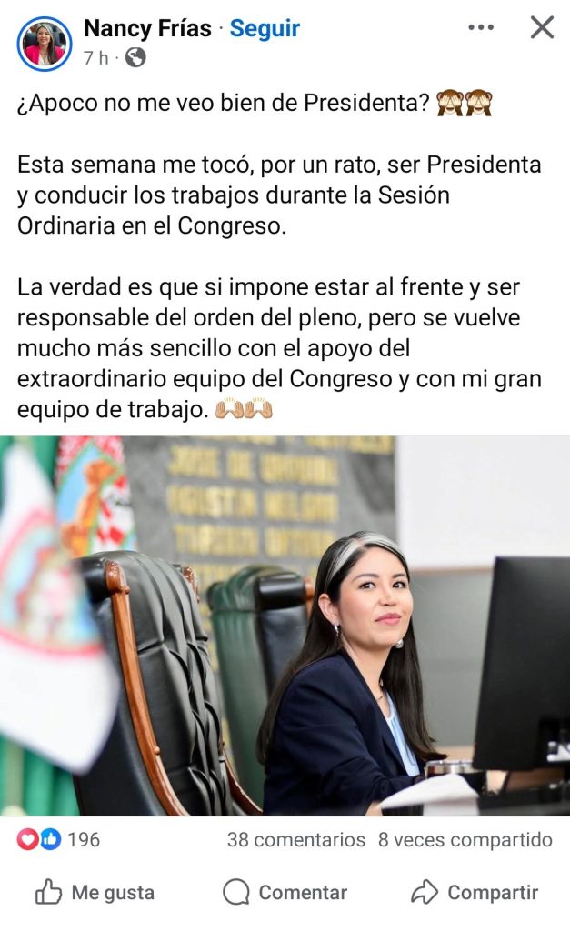 La diputada local del PAN, Nancy Frías, conocida como “La China”, compartió en redes sociales un momento especial que vivió esta semana en el Congreso del Estado: por un rato le tocó ser presidenta y conducir los trabajos de la sesión ordinaria.
