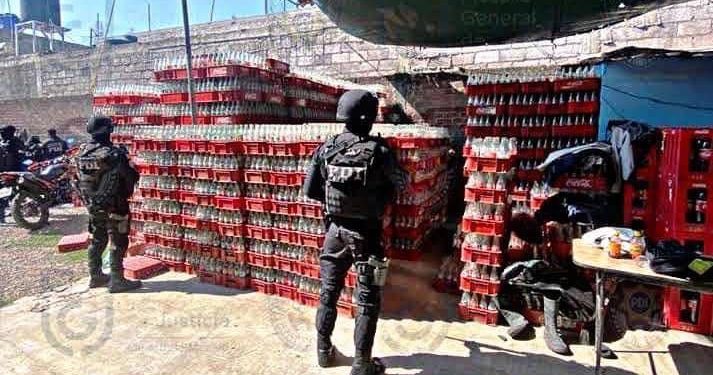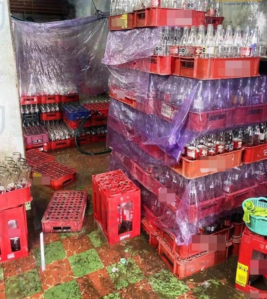 Policías de Investigación lograron asegurar el inmueble, junto con varios paquetes de refresco, cada uno con 12 envases de vidrio, así como más de 900 cajas de plástico con botellas listas para ser llenadas y vendidas.