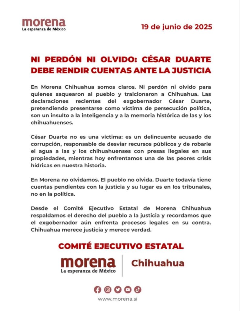 Por último, aseguran que, desde el Comité Ejecutivo Estatal de Morena Chihuahua, respaldan el derecho del pueblo a la justicia «y recordamos que el exgobernador aún enfrenta procesos legales en su contra. Chihuahua merece justicia y merece verdad», concluye.