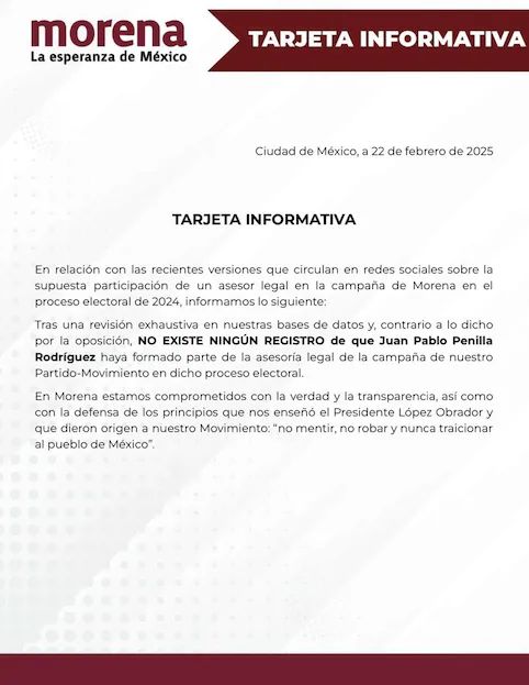 Además, posteó un comunicado en el que destacó que «no existe ningún registro de que Juan Pablo Penilla Rodríguez haya formado parte de la asesoría legal de la campaña de nuestro Partido-Movimiento en dicho proceso electoral.»