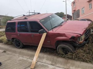 Los hechos se registraron cerca de las 18:30 horas de ayer domingo en el cruce de las calles Frontera Calexico y Suecia, hasta donde llegaron oficiales de Vialidad y paramédicos de Cruz Roja, encontrando una Ford Explorer color guinda, de modelo atrasado, la cual se encontraba fuera de la cinta asfáltica en una pequeña loma, misma que, aparentemente, se quedó sin frenos, impactando por detrás a un Nissan Tsuru, color gris, modelo atrasado, mismo que presentaba un fuerte golpe en la parte frontal.
