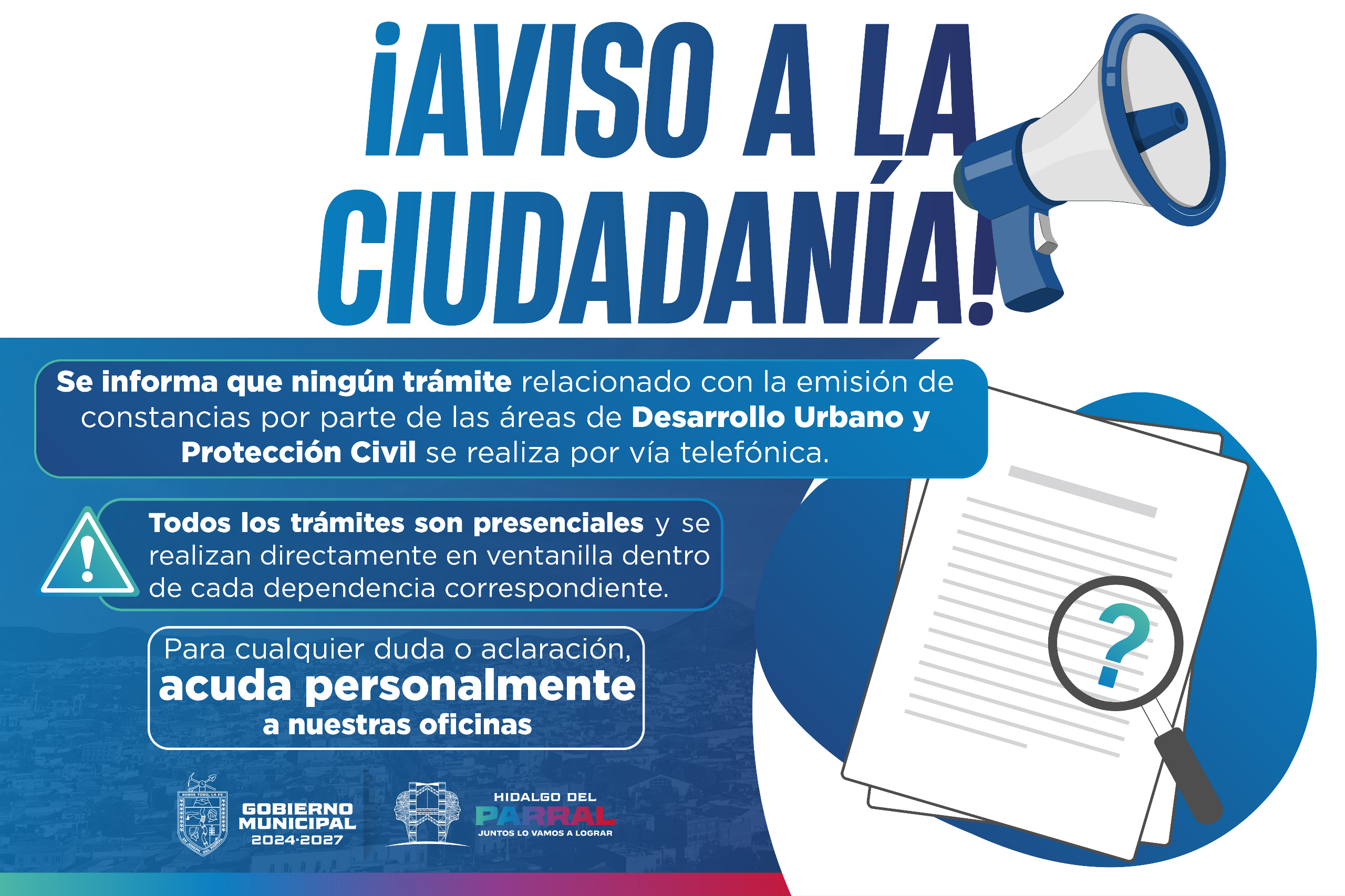 El Gobierno de Parral informa a la ciudadanía que ningún trámite municipal se lleva a cabo por vía telefónica, especialmente aquellos relacionados con la emisión de constancias por parte de las dependencias de Desarrollo Urbano y Ecología, así como de Protección Civil.