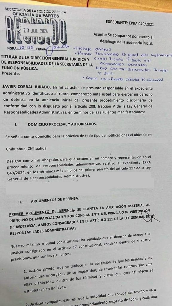 Cabe recordar que el pasado 5 de julio, la Secretaría de la Función Pública (SFP) notificó a Corral Jurado sobre la apertura de un procedimiento en su contra por probable enriquecimiento ilícito y defraudación fiscal.