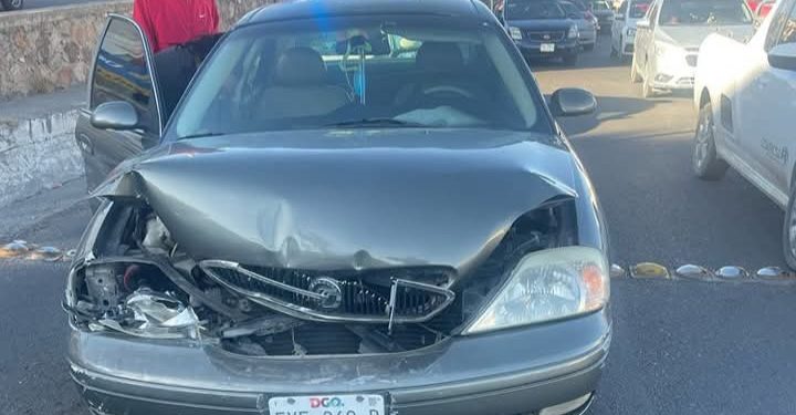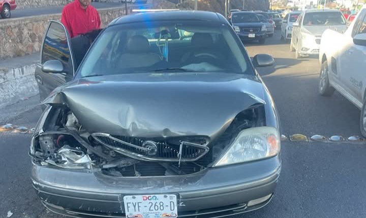 Fue en el cruce de la calle Carlos Isaac Lara que conduce a la Presidencia Municipal donde se produjo el accidente, resultado de que la conductora de un Ford Sable con placas de Durango, no alcanzó a frenar al llegar a las boyas que funcionan con reductores de velocidad, estampándose contra una Nissan X-Trail 2025.