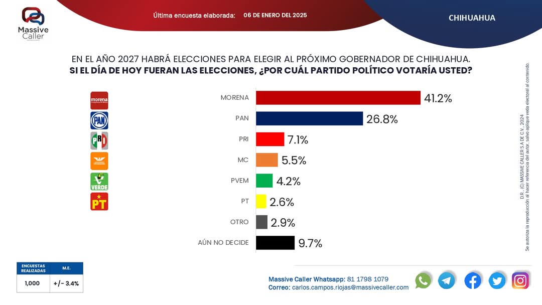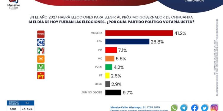 Entrando en materia de números, según Massive Caller, Morena encabeza las preferencias para la gubernatura del Estado en el 2027 con el 41% de las menciones y sin alianza, porque sí le sumamos los cuatro puntos del Verde Ecologista, se va hasta más del 45 por ciento incluyendo los decimales.
