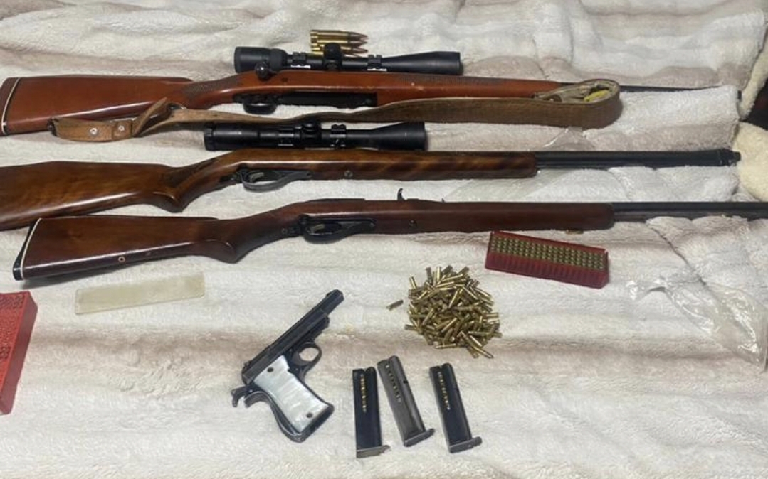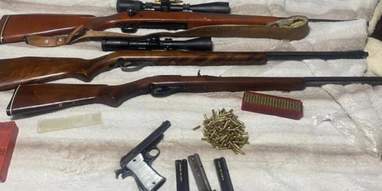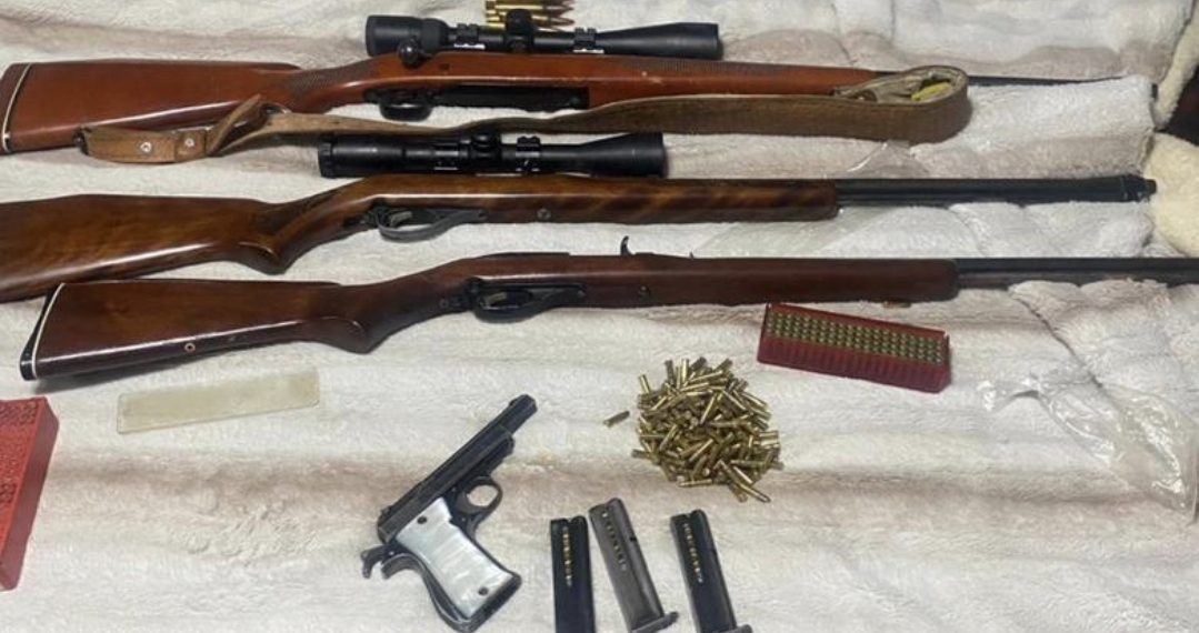 En la fotografía se observan tres rifles con mira telescópica, una pistola, cargadores abastecidos y cartuchos, acomodados sobre una cama, presuntamente como resultado de un aseguramiento tras las detonaciones registradas la noche del 31 de diciembre por los festejos de Año Nuevo.