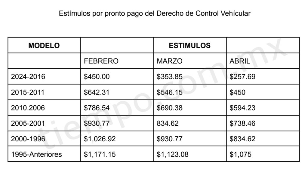 Por ejemplo, por una unidad modelo 2016-2024 deberá realizar el pago más impuestos y, en caso de que se desee cubrir el costo en febrero, tendrá un descuento de $450 sobre su total; en caso de realizarlo en marzo el descuento será de $353.85 pesos sobre el total; en abril será de $257.69 sobre el total.