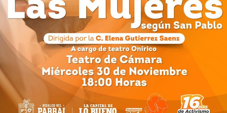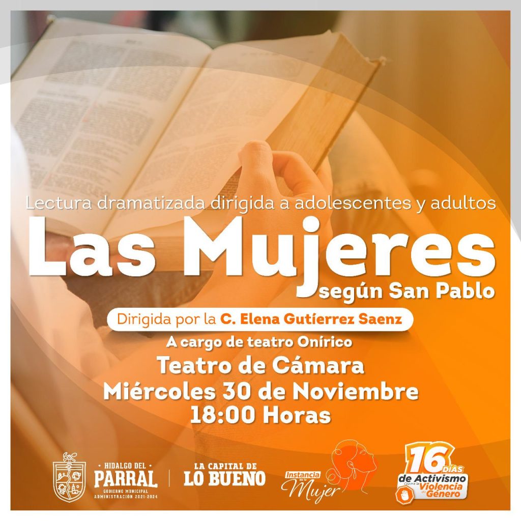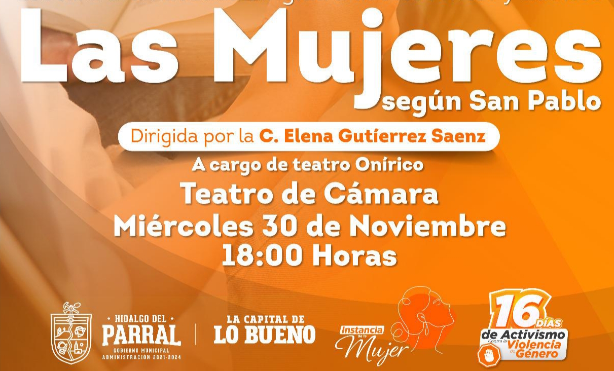 En el marco de las actividades del programa “16 días de activismo contra la violencia de género” que organiza el Gobierno de Parral, se desarrollará este miércoles 30 de noviembre la puesta en escena de la obra “Las Mujeres según San Pablo” a cargo del Teatro Onírico con entrada gratuita para la ciudadanía.