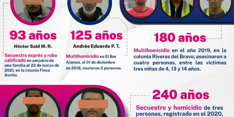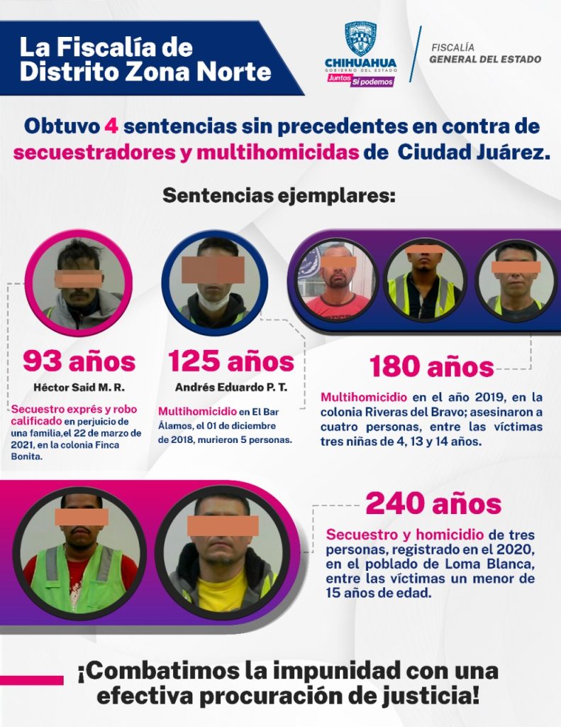 Resultado de las diligencias de investigación y litigación llevadas a cabo por la Fiscalía de Distrito Zona Norte, durante el mes de junio se obtuvieron cuatro sentencias condenatorias ejemplares de 93, 125, 180 y 240 años de cárcel en contra de responsables de multihomicidios y secuestros cometidos en Ciudad Juárez.