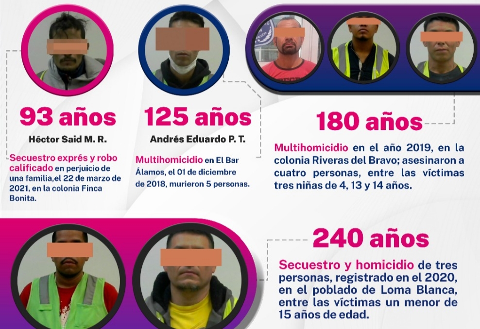 El trabajo multidisciplinario de campo y gabinete a cargo de la Unidad Especializada en la Investigación de Delitos Contra la Vida, permitió que un Tribunal de Enjuiciamiento emitiera una sentencia de 180 años de cárcel en contra de Álvaro O. N., Daniel C. O. y Manuel Jesús L. E., por el homicidio de cinco personas registrado en el año 2019 en la colonia Riberas del Bravo; entre las víctimas resultaron tres mujeres menores de edad, una de 4, una de 13 y otra de 14 años.