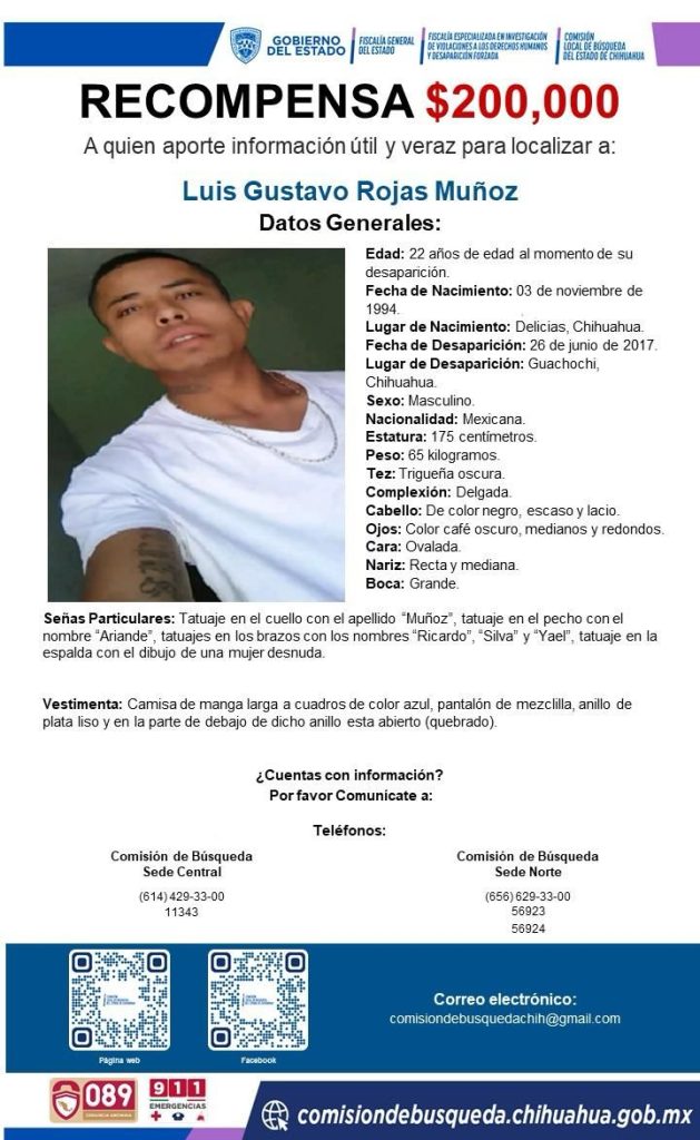 Por su parte, Luis Gustavo Rojas Muñoz, nacido el 3 de noviembre de 1994 también en Delicias, vestía camisa de manga larga a cuadros azules, pantalón de mezclilla y portaba un anillo de plata. Entre sus señas particulares destaca un tatuaje en el cuello con el apellido “Muñoz”, en el pecho el nombre “Ariande”, así como otros tatuajes en brazos y espalda.