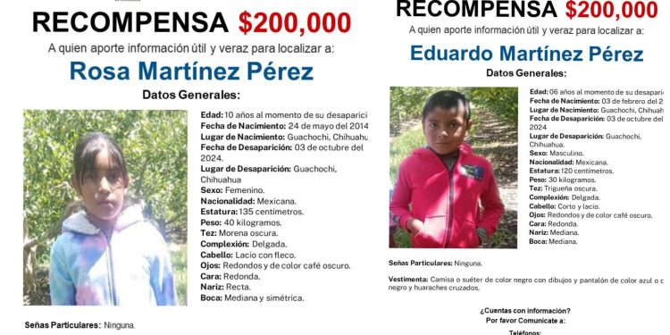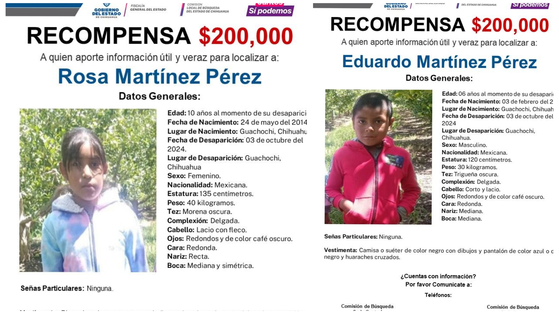 Tras dos meses de búsqueda ininterrumpida, la Comisión Local de Búsqueda lanza el pago de recompensa para localizar a los hermanitos Rosa y Eduardo Martínez Pérez, desaparecidos el pasado mes de octubre en el municipio de Guachochi.