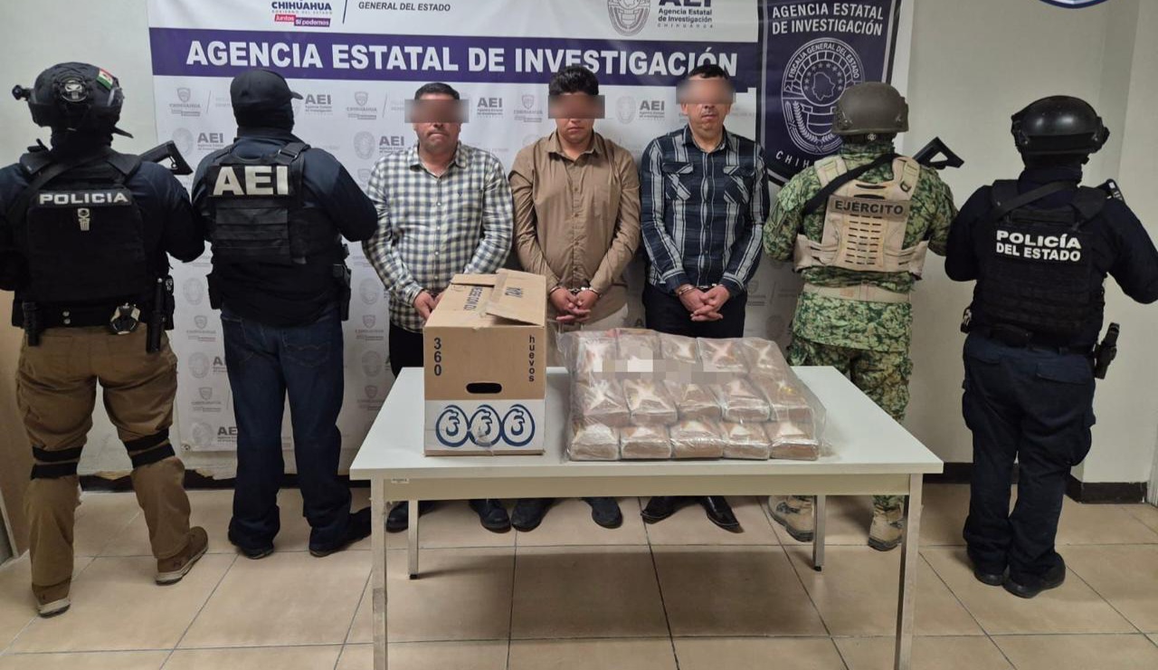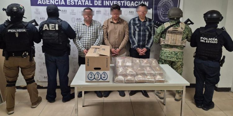 A través de trabajos de inteligencia, análisis, seguimiento, vigilancia y tecnología con que cuentan los grupos especiales de la Agencia Estatal de Investigación, en coordinación con la Secretaría de la Defensa Nacional, Guardia Nacional, Secretaría de Seguridad Pública Estatal y Policía Municipal, se detuvo a tres masculinos con más de 26 kilos de cocaína.