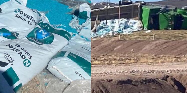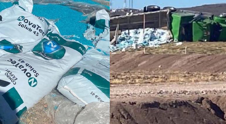 Ciudadanos rapiñaron varias tolenadas de fertilizante después de un tráiler que sufrió un accidente en la carretera Jiménez a Camargo, en el kilómetro 34, donde volcó.