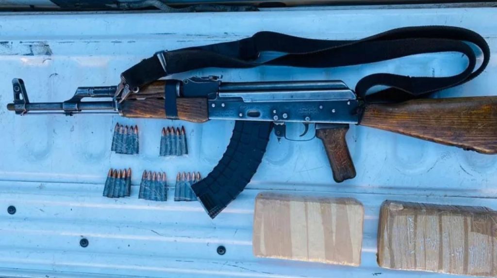 Dentro del vehículo, una camioneta Chevrolet Tahoe, de color blanco, modelo 2002, se localizaron 2 cuadros en forma de ladrillo conteniendo una hierva verde, seca y olorosa con las características de la marihuana, así como un fusil de asalto calibre 7.62×39 con un cargador de plástico abastecido con 28 cartuchos útiles del mismo calibre.